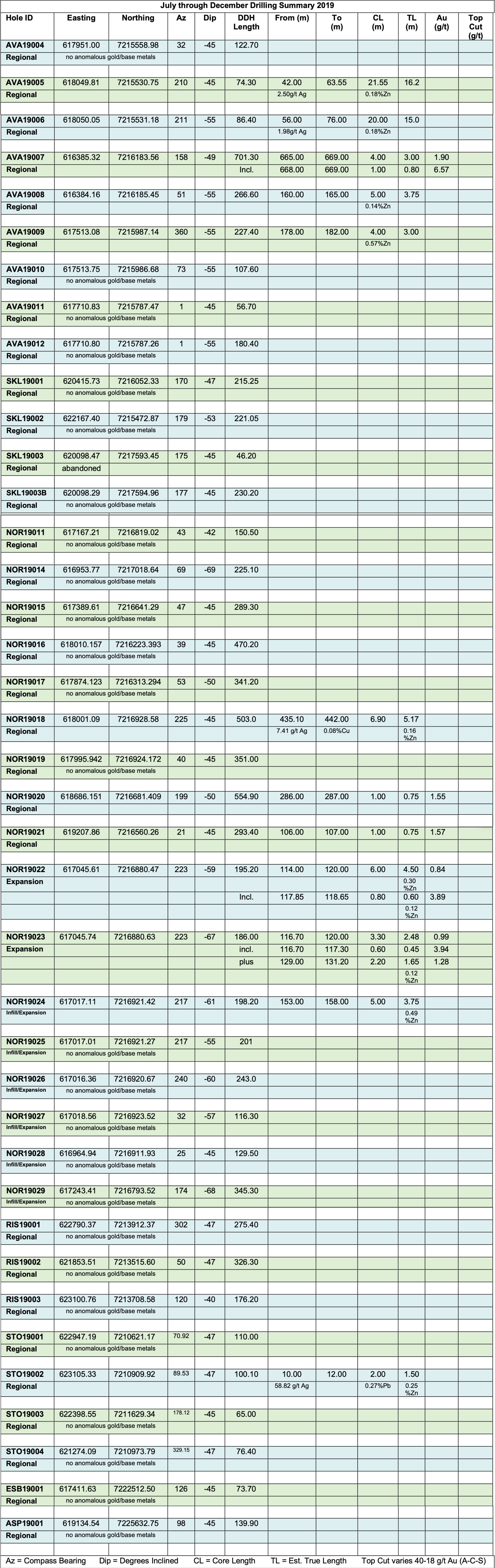 The 2019 drilling results included in this news release have been principally focused on “Regional VMS Targets” along with some “Orogenic Gold” target testing throughout the 50,800-hectare property. Nine regional holes were drilled at Avan (AVA19004 through AVA19012). Four regional holes were drilled at Skirliden (SKL19001, SKL19002, SKL19003 (abandoned), SKL19003B). Seventeen holes were drilled in the Norra area, with nine being regional (NOR19011, 19014 through NOR19021, plus NOR19025 through NOR19029). Infill/Expansion holes include (NOR19022 through 19024). At Risberget three regional holes were drilled (RIS19001, RIS19002, RIS19003). At Stortrasket, four regional holes were drilled (STO19001 through STO19004). Finally, regional holes ESB19001 and ASP19001 were VMS tests.