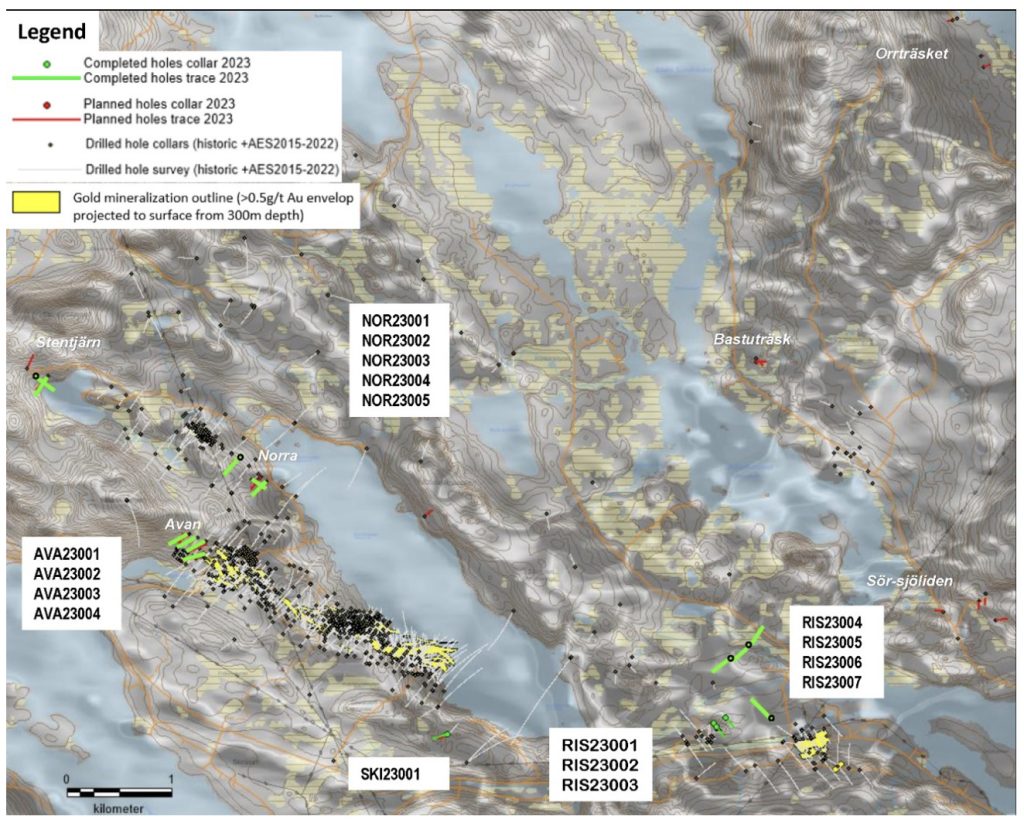- – Drilling at Risberget encountered broad zones of Orogenic style alteration with anomalous gold mineralization, occurring some 2.6 kilometres southeast from the Avan–Central–Skiråsen gold mineralized resource boundary.
