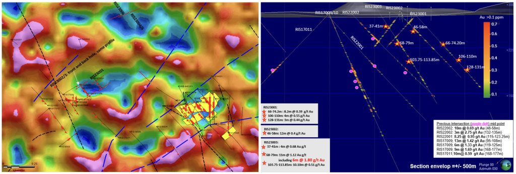 Hole RIS23001 intersected strongly albitized andesite, between 64 and 84 metres down hole, with arsenopyrite and anomalous gold mineralization occurring between 66 and 78 metres. This hole extends the anomalous gold mineralized trend over 250 metres along a northeasterly projection. Assay results include 8.2 metres @ 0.39 g/t Au, 1.0 meter @ 1.49 g/t Au, 4.0 metres @ 0.55 g/t Au, 3.0 metres @ 0.44 g/t Au and 1.0 m @ 1.21 g/t Au.