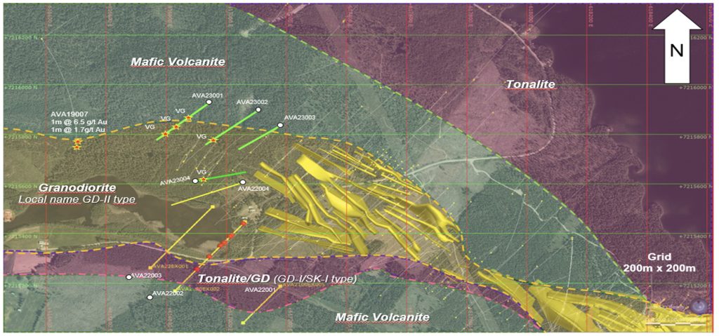 Hole AVA23001 was drilled in a southwesterly direction and hit the favourable granodiorite unit GD-II at 58.0 metres down hole. Visible gold was observed at 142.6 metres, 185.2 metres and 213.2 metres. Favourable quartz veining and arsenopyrite mineralization were observed throughout the entire GD II portion of the hole. This drilling extends the gold mineralized Avan Zone 300 metres to the northwest from the end of the Avan resource wireframes. Analytical results are pending.