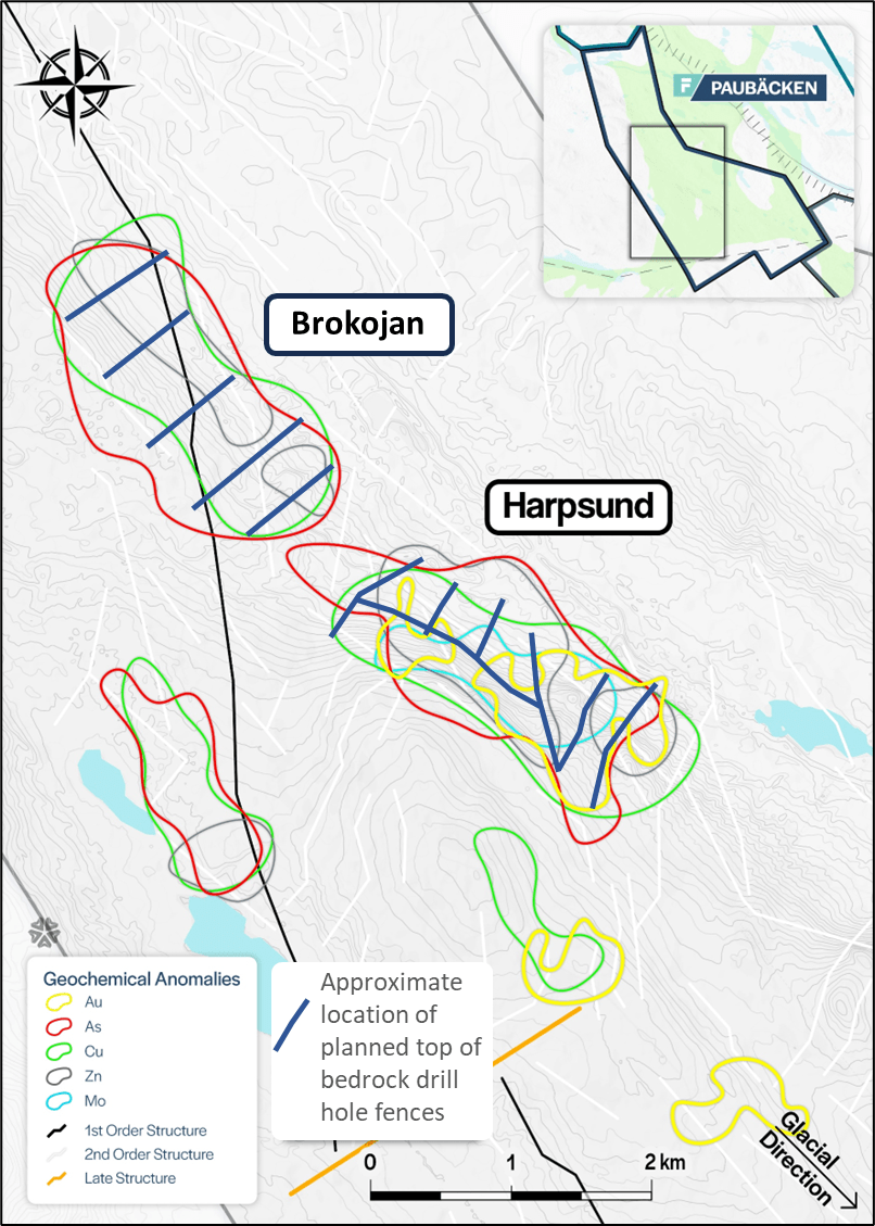 Taj Singh, CEO remarks: ”The multi-kilometric Brokojan target was identified last year from the Paubӓcken project gold pathfinder till sampling program. When Brokojan was combined with the previously identified and adjacent Harpsund anomaly, a 5.5 km long target area (strike) emerged. To put this in context, the Company’s Barsele project resource footprint length is approximately 3.5 km. Also noteworthy is that the Company’s ~4 km Aida target, at the Paubӓcken project and slated to start diamond drilling in a few weeks, is only few km south of the Harpsund-Brokojan target area. Our top-of-bedrock (“BoT”) drilling at Harpsund and Brokojan will provide us key geochemical information (gold and pathfinder assays of bedrock) for these targets, setting them up for diamond drilling later this year. BoT drilling has been a critical step for mineral deposit discovery and delineation in the Nordics and has a strong correlation with diamond drilling results.”