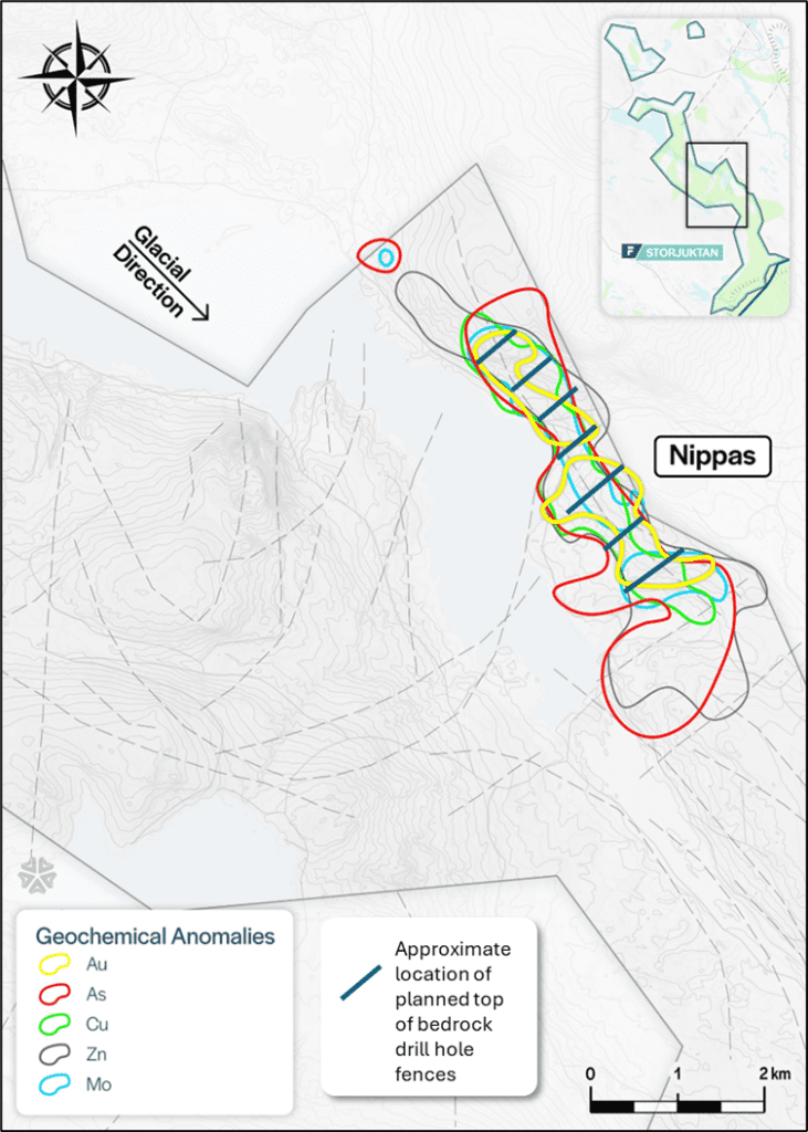 Taj Singh, FNM CEO comments: “The Nippas target currently being tested represents an extensive gold and pathfinder element till anomaly on the Storjuktan project, located 28 kilometres north of our resource-stage Barsele project. Nippas is located on a second order splay structure within the Gold Line structural corridor in a setting ideal for large orogenic gold deposits. BoT drilling is the most effective method of targeting potential new discoveries through glacial till cover and has already proven fruitful at our Paubäcken project’s Aida discovery further south. This BoT program sets us up well for diamond drilling Nippas in 2025. On the back of our recent financing, we are now fully funded for aggressive drilling on multiple multi-kilometric targets on the Gold Line through 2025.”