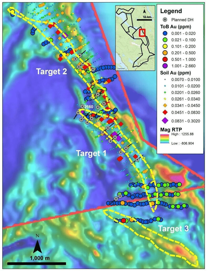 - Target 1: A 2.2 km-long Au-As-Cu-Zn-Mo surface till anomaly coincident with strongly elevated ToB results (up to 2.66 ppm Au). The anomaly is located along a geophysical trend interpreted as a sheared contact between two lithological units. Target 1 will be initially tested with up to 3,600 m of diamond drilling in 16 holes