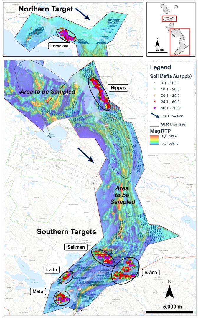 The southern target area contains three main sub-parallel, anastomosing shear corridors comprising the Gold Line belt structural corridor. The structures transect and form contacts between lithologies, collectively forming a complex anastomosing network of flexures and intersections. Underlying geology of the southern target area consists of inverted metasedimentary, metavolcanic, metavolcaniclastic units intruded by smaller syn-tectonic granitic intrusions. The target area is bounded to the north by a large syn-tectonic granite intrusion that acts as a buttress for the supracrustal units and structures to wrap around. These structures were targeted in the 2024 till sampling program. Four new target areas at Bråna, Sellman, Meta, and Ladu have been identified in the southern target area in 2025.