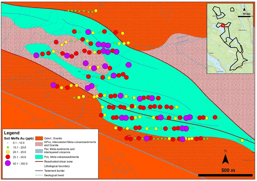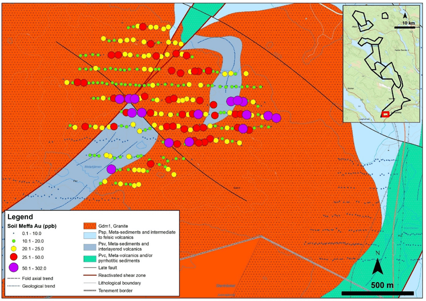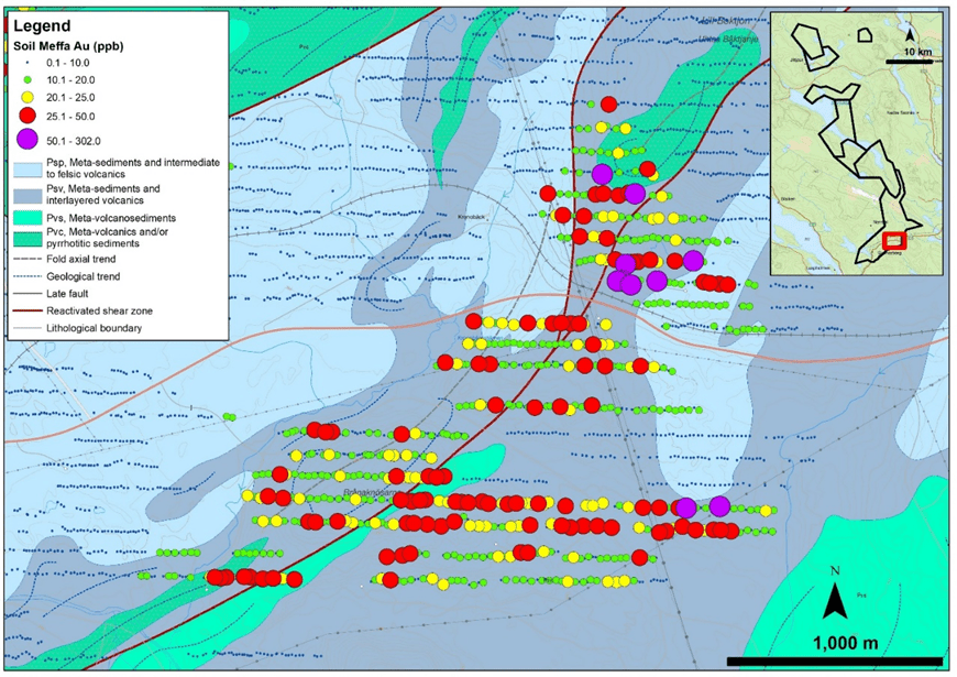 The Project contains over 60 km of the regionally significant “Gold Line” structure which can be traced for over 200 km in regional geophysics data. The Gold Line was first recognized in the late 1970s as a large arsenic-in-soil anomaly formed by a regional fault. All mineralization discovered to date shows a spatial relationship to this structural corridor, occurring either in the main shear corridor or on perpendicular structures within a few km of the main structures. The geology of the Storjuktan project consists of a sequence of inverted basin sediments and mafic volcanic rocks intruded by small syn-kinematic granitic intrusions within a broad, anastomosing high strain structural corridor. The rocks are regionally metamorphosed to amphibolite facies and gold mineralization is associated with intense biotite, and calc-silicate alteration assemblages and sulphide minerals pyrrhotite, arsenopyrite, and minor other sulphides. These lithological sequences are highly prospective for orogenic gold deposits.