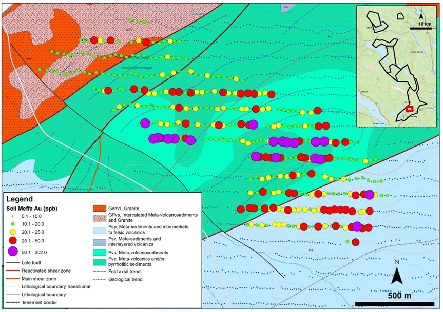 The Ladu target is a linear gold-in-till anomaly that strikes 1.2 km along a regional structural corridor perpendicular to the down ice direction. Sampling at this target area in the down ice direction was limited due to swampy ground conditions. The underlying geology is dominated by metavolcanics / metavolcaniclastic sediments along the sheared contact with a large granite intrusion. The anomaly is interpreted to be sourced from the regional shear which forms the contact between the intrusion and supracrustal units along which the gold anomaly is coincident. Within the metavolcanic / metavolcaniclastic units metal associations are generally Au-As-Cu with till sample results up to 55 ppb. The area analysed for gold at the Ladu target was limited and is planned to be expanded along the interpreted shear zone orientation. Follow up BoT-ToB drilling is planned to test this target with fences perpendicular to the regional structure orientation.