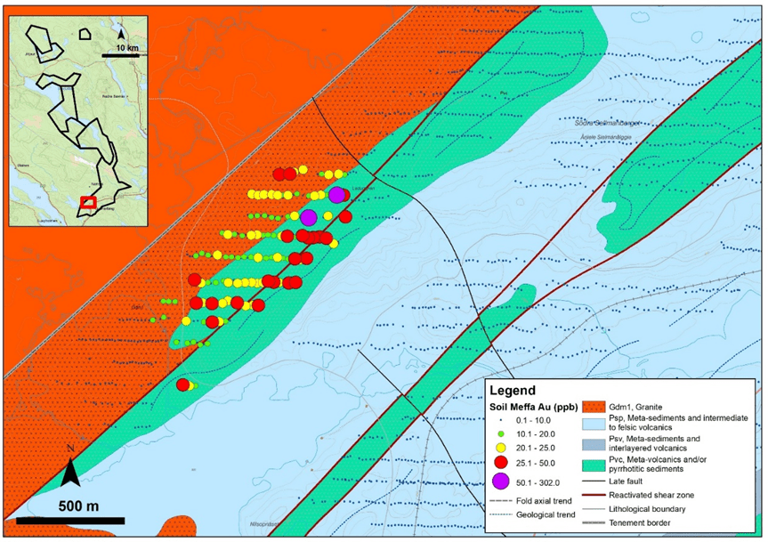 A subset of samples from identified target areas with anomalous pathfinder element signatures were selected for gold (“Au”) assay at MEFFA Lab Oy. Samples are prepared at MEFFA where the fine fraction is separated in a wet sieving process and subsequently analysed by laser ablation ICP-MS (inductively coupled plasma mass spectrometry) for gold. In total 1,936 samples from five identified target areas were selected for Au analysis within the Storjuktan concession area. Regional glacial till sampling surveys have identified widespread, newly discovered gold mineralization in multiple locations across the Storjuktan concession returning strongly anomalous gold results associated with multiple shear corridors within the belt. Results from the Au analysis show a strong correlation to orogenic gold pathfinder element anomalies and are interpreted to be derived from various bedrock lithologies and shear zones identified from geophysics data. Due to the extent of the Au anomalies encountered, FNM plans to increase the Au analysis coverage over greater areas of receptive geology and structural corridors with a second batch of samples.