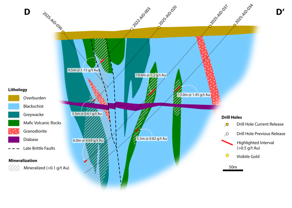 - Drill hole 2025-AID-034, 18.1m @ 1.17 g/t Au is interpreted to make up a potential new zone.